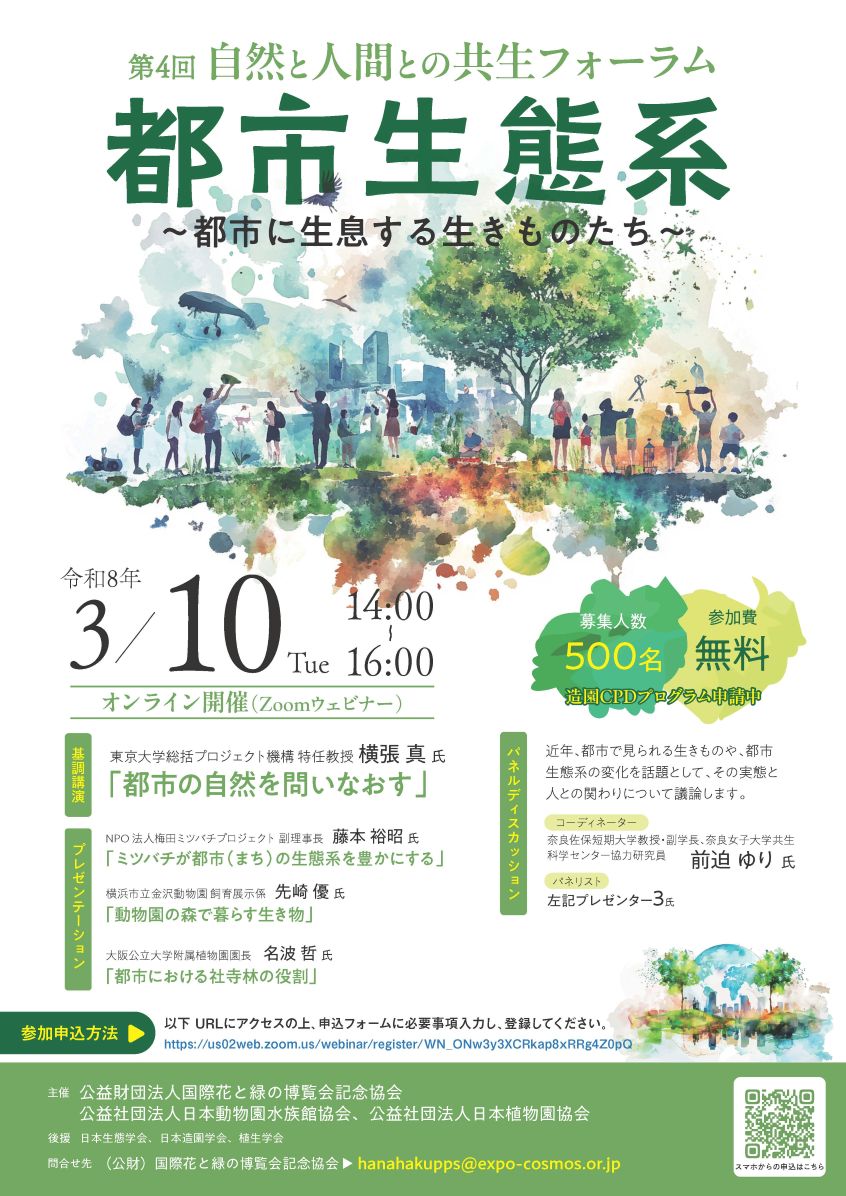 このたび、(公財)国際花と緑の博覧会記念協会、(公社)日本動物園水族館協会、(公社)日本植物園協会の3団体は「第4回自然と人間との共生フォーラム」をオンラインで開催いたします。